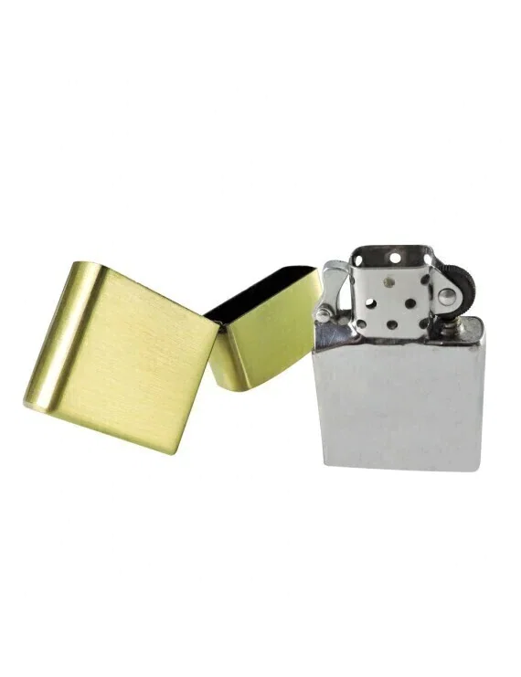 Encendedor de metal bañado en bronce con mecanismo de recarga de bencina. Incluye caja de presentacion. Se etrega sin combustible.