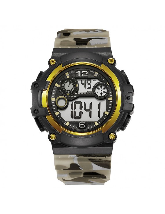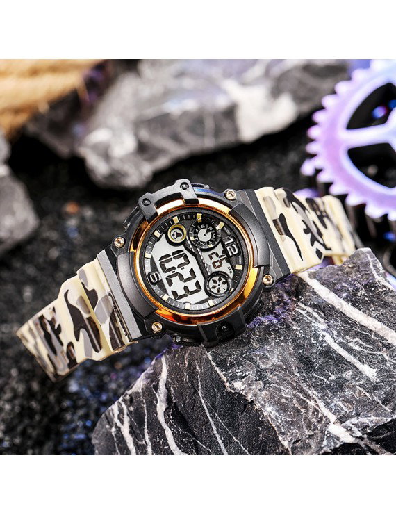 Reloj deportivo robusto con malla de silicona color camuflado • Hora, minutos, segundos • Fecha, dia de la semana • Cronómetro • Luz led ilumina pantalla • Alarma • Formato 12 / 24 horas