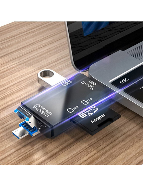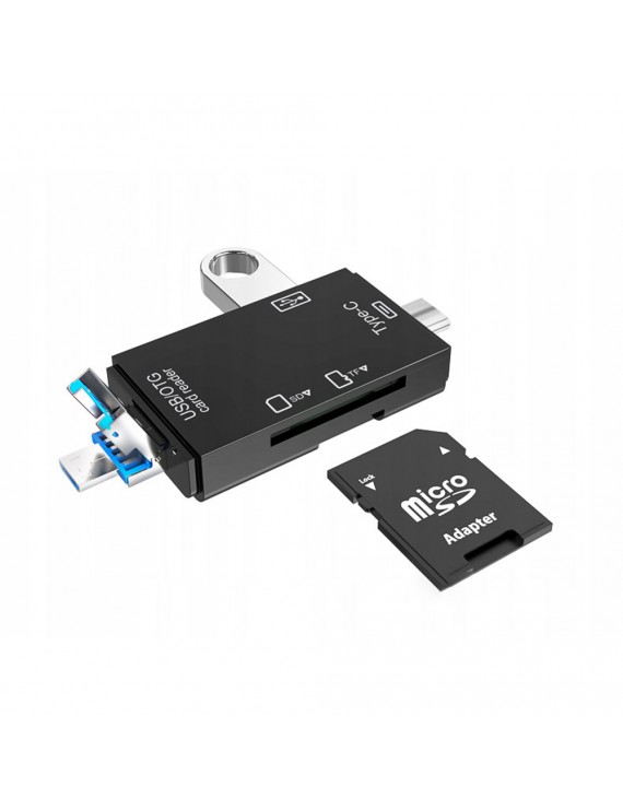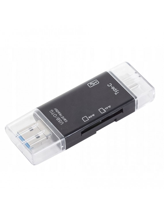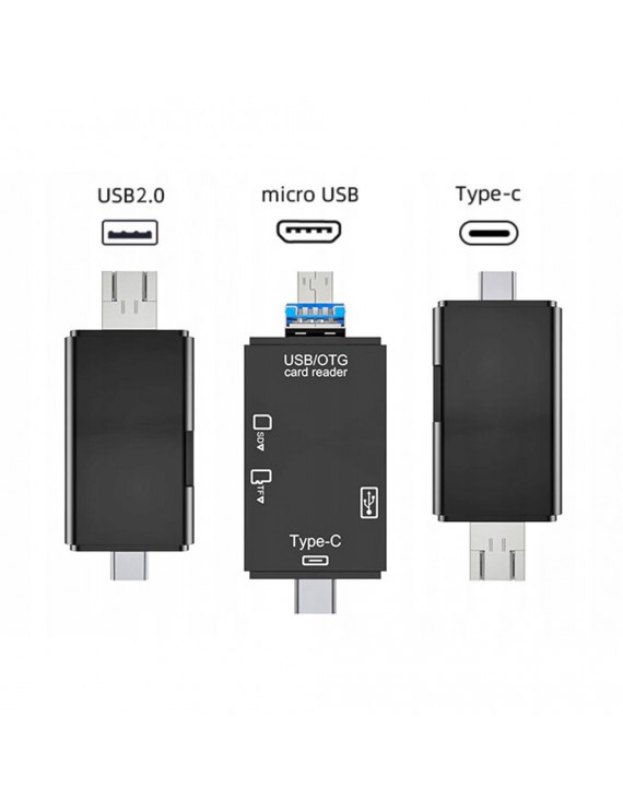 LECTOR DE MEMORIAS OTG MICRO SD TF MICRO USB +USB Parámetros del producto: 1. Nombre del producto: lector de tarjetas OTG tipo C 5 en 1 2. Color: Negro, Blanco 3. Material: Materiales ABS. 4. Función del producto: USB 2,0 macho + MICRO macho + tipo C macho, Lee rápidamente tarjetas de memoria TF, teclado externo con interfaces USB macho, ratones, discos flash USB, escudos USB, gamepads y otros dispositivos USB. 5. Equipos compatibles: teléfonos móviles, Macbook (USB tipo C), portátiles de Google, ordenadores comunes (Windows ). 6. Compatible con múltiples sistemas: compatible con Micro / Usb/Tipo-c/TF