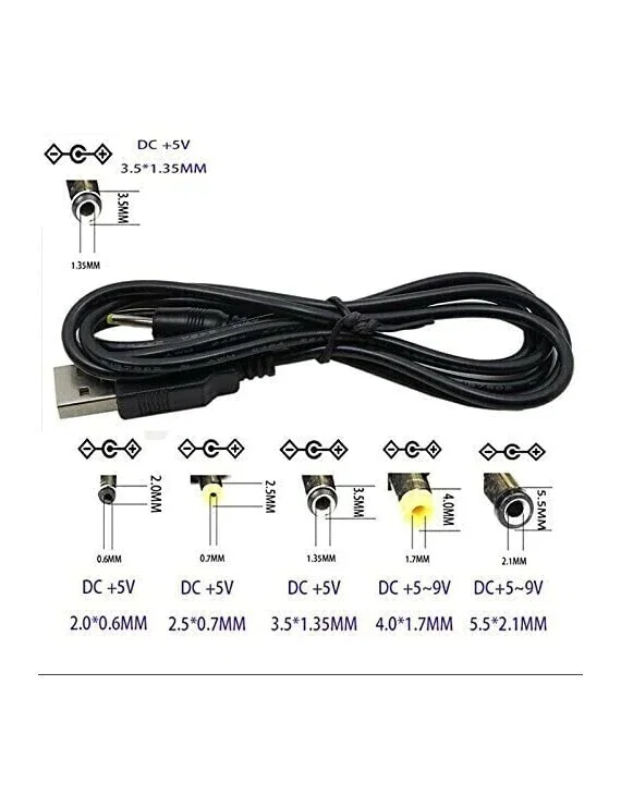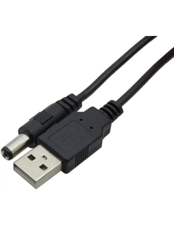 Enchufe USB macho tipo A a conector macho coaxial / barril de 5,5 mm (exterior), 2,1 mm (interior) con clavija central positiva.