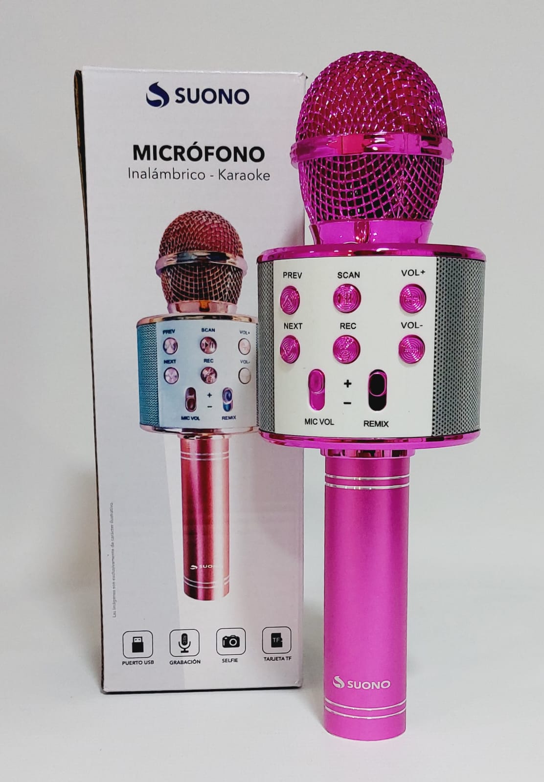 Micrófono inalámbrico con parlante incorporado que se conecta a dispositivos móviles por Bluetooth para reproducir música directamente de aplicaciones como Spotify, YouTube, entre otras.