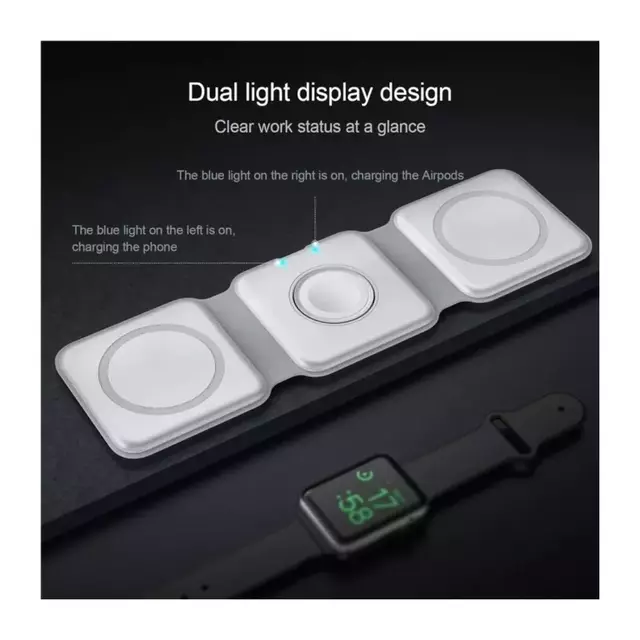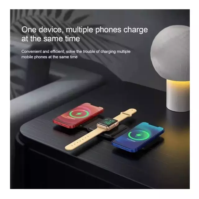 Mantén tus dispositivos Apple siempre cargados y listos para usar con nuestro Cargador Inalámbrico 3 en 1. Este versátil cargador ofrece una solución conveniente y elegante para cargar tu iPhone, Apple Watch y AirPods simultáneamente, sin cables ni enredos.