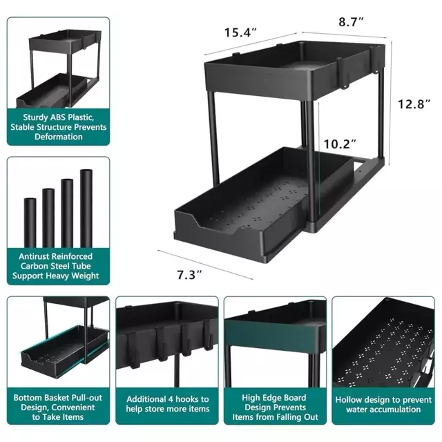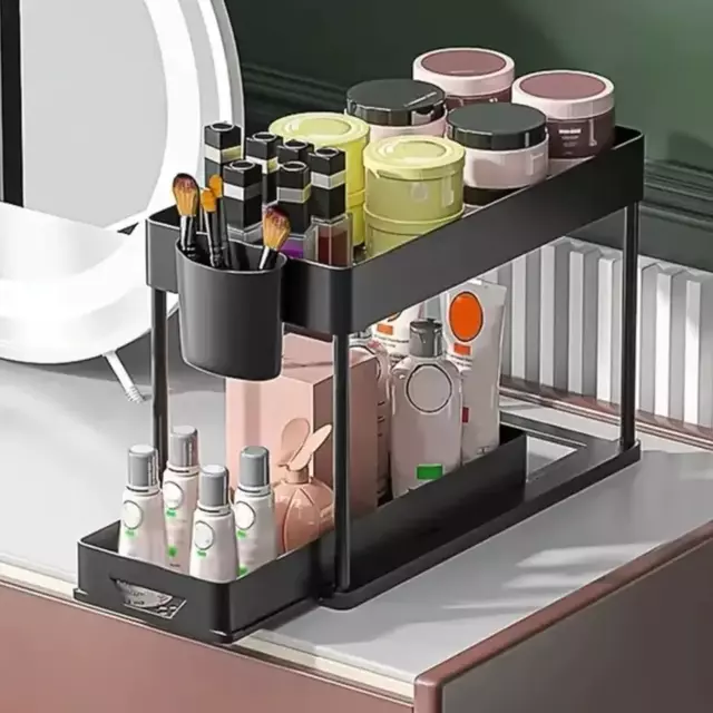 Estante multifuncional de doble capa diseñado para optimizar el espacio en cocinas, baños y oficinas. Su diseño deslizante permite un acceso fácil a los objetos, manteniendo todo ordenado y al alcance.