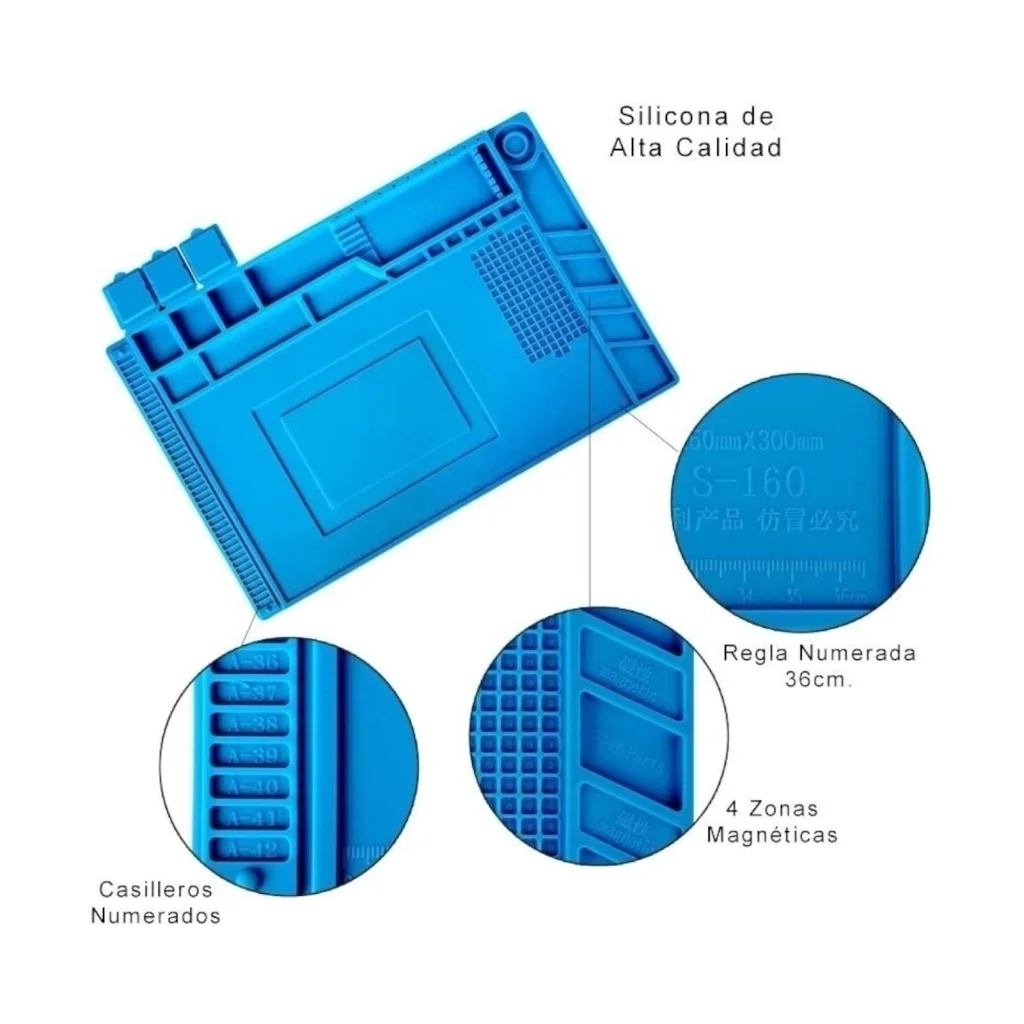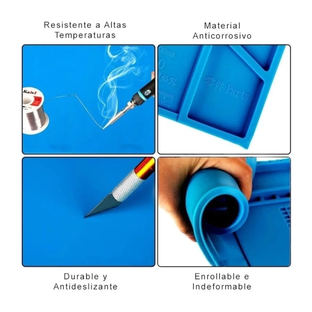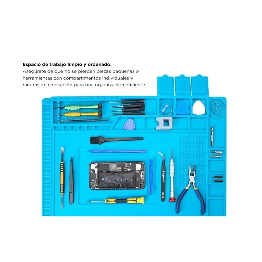 Descripción: Protección de la superficie: la alfombrilla de soldadura de silicona protege tu espacio de trabajo de quemaduras resistiendo temperaturas de hasta 500°C. Espacio de trabajo limpio y ordenado: mantiene un entorno de trabajo limpio y organizado. Asegúrate de que no se pierden piezas pequeñas o herramientas con compartimentos individuales y ranuras de colocación para una organización eficiente.