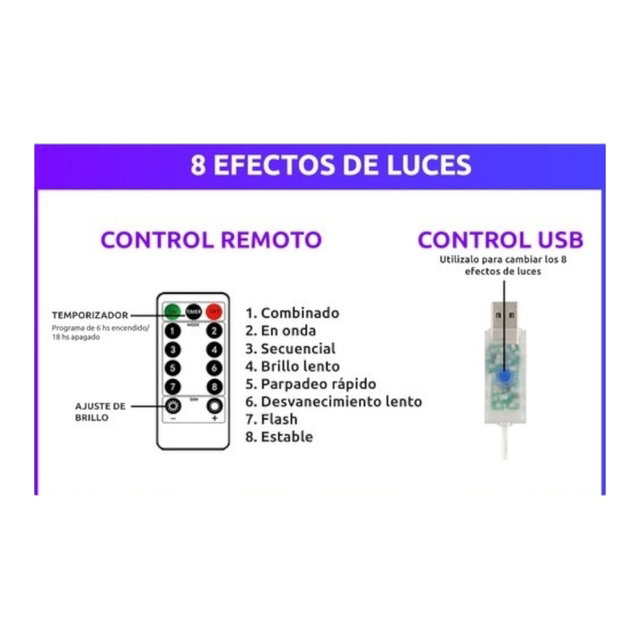 - Control de Efectos: Incluye un control remoto que permite cambiar entre 8 diferentes efectos de luz, ajustando el ambiente según tus preferencias y la ocasión.