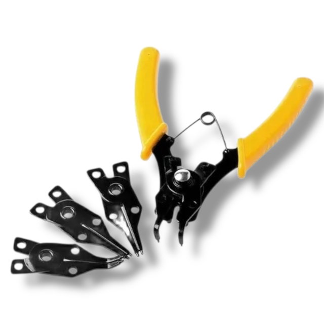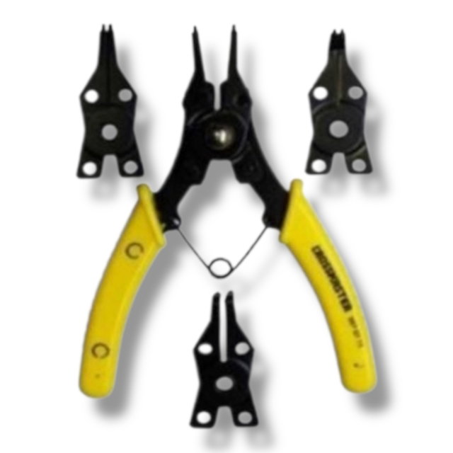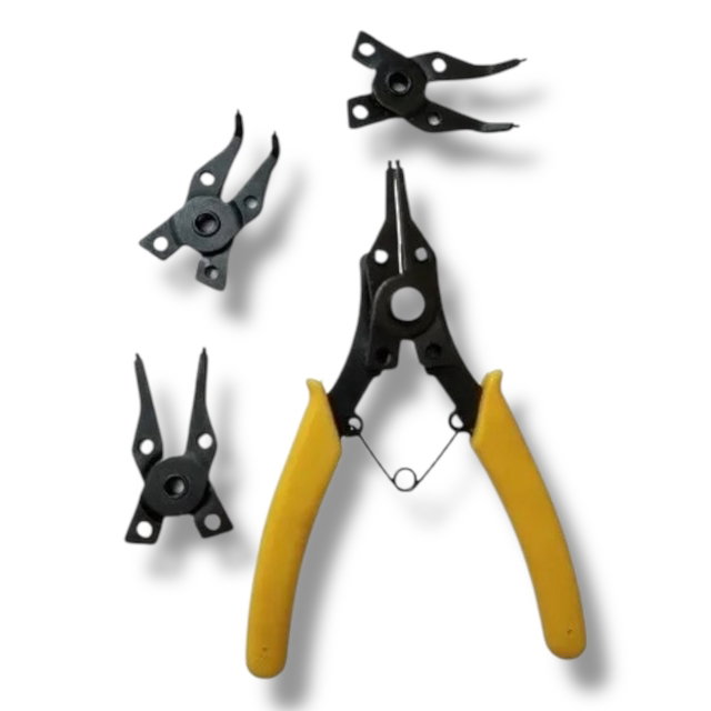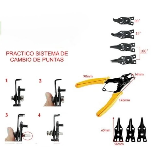 Herramienta esencial para trabajos de precisión. Esta pinza para anillos tipo Seguer cuenta con 4 puntas intercambiables diseñadas para uso interno y externo, garantizando versatilidad y firmeza en tareas mecánicas, relojería, electrónica o mantenimiento general.