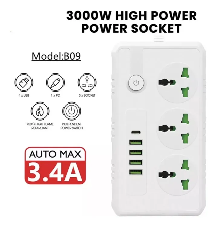 Alargador Inteligente 3 Tomas + 4 USB + 1 Tipo C – Modelo B09