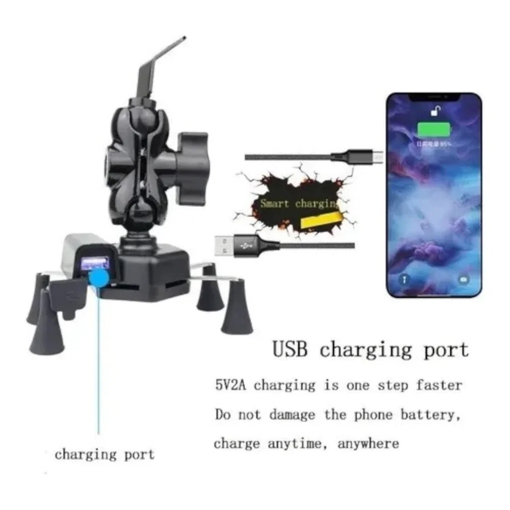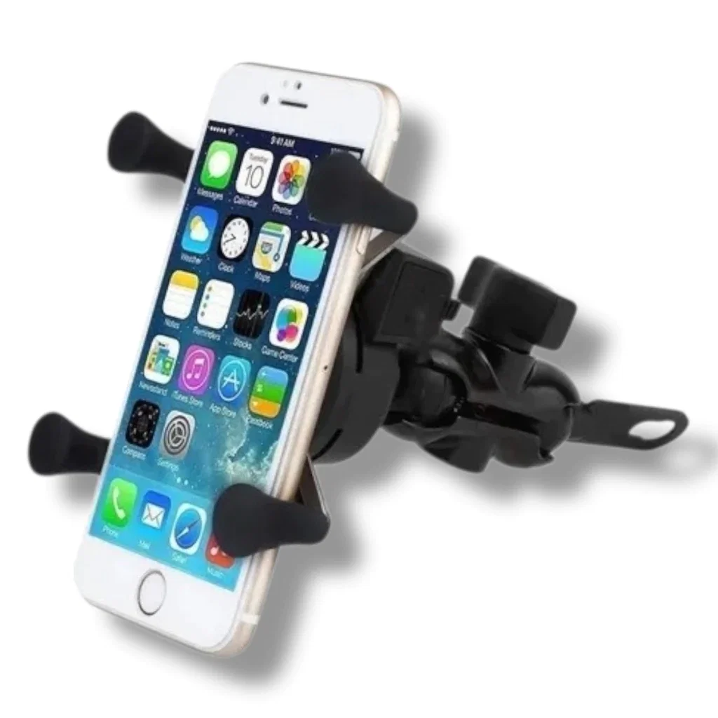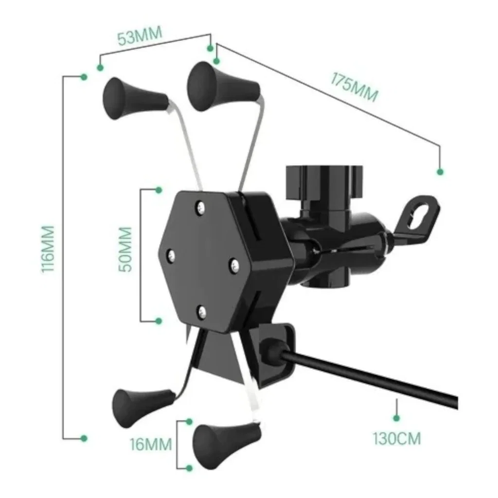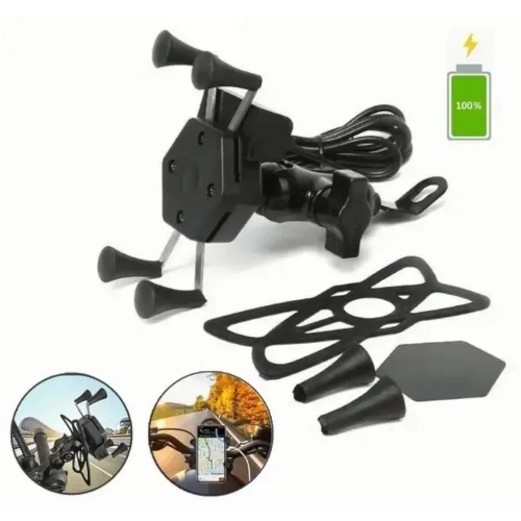 Soporte ajustable para sujetar el teléfono móvil en motocicletas. Incluye puerto USB integrado para carga directa durante el viaje.