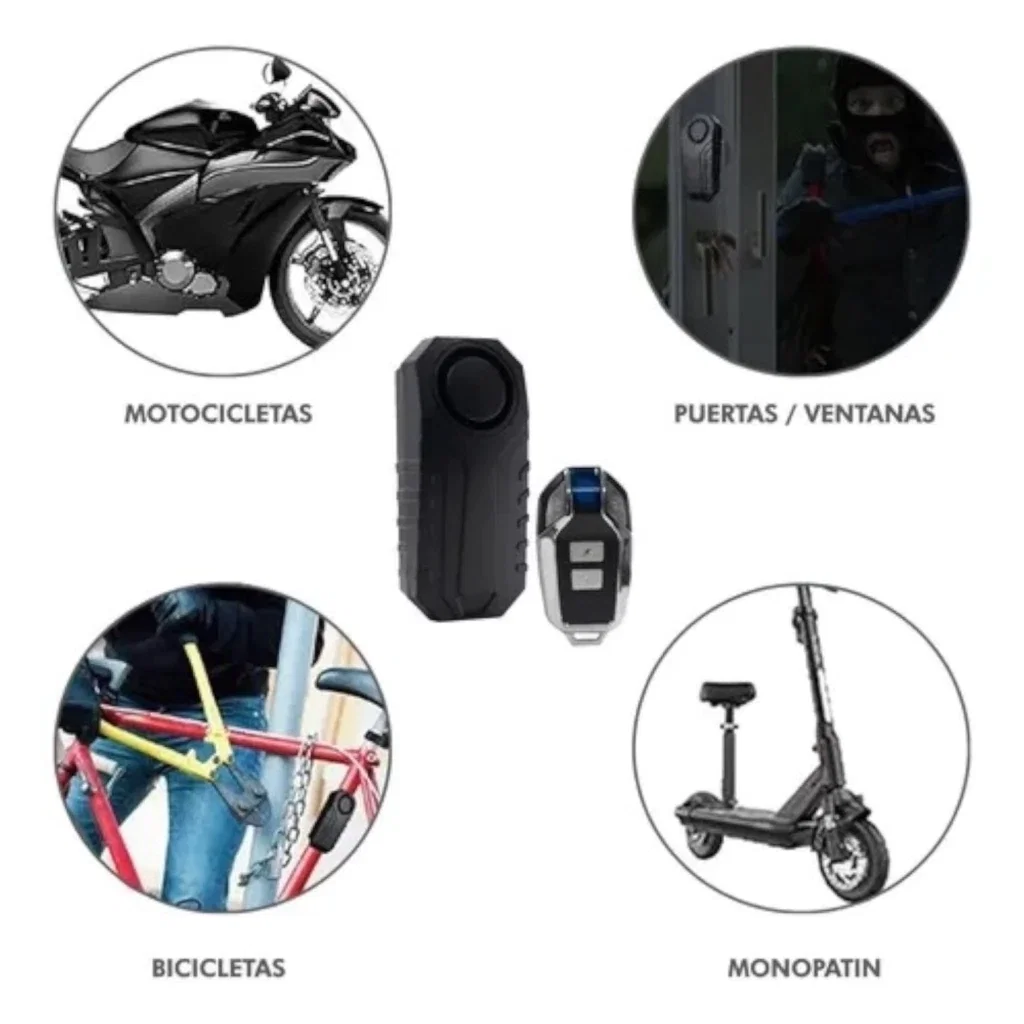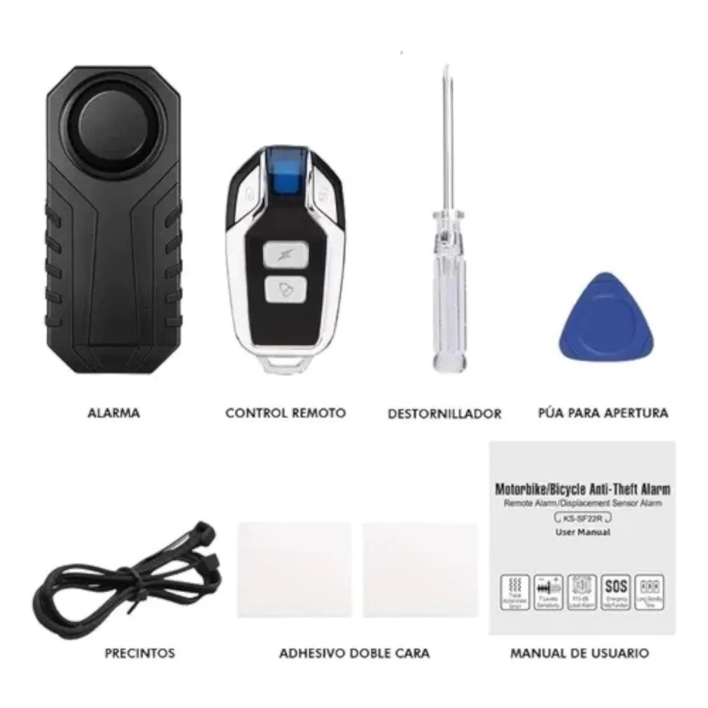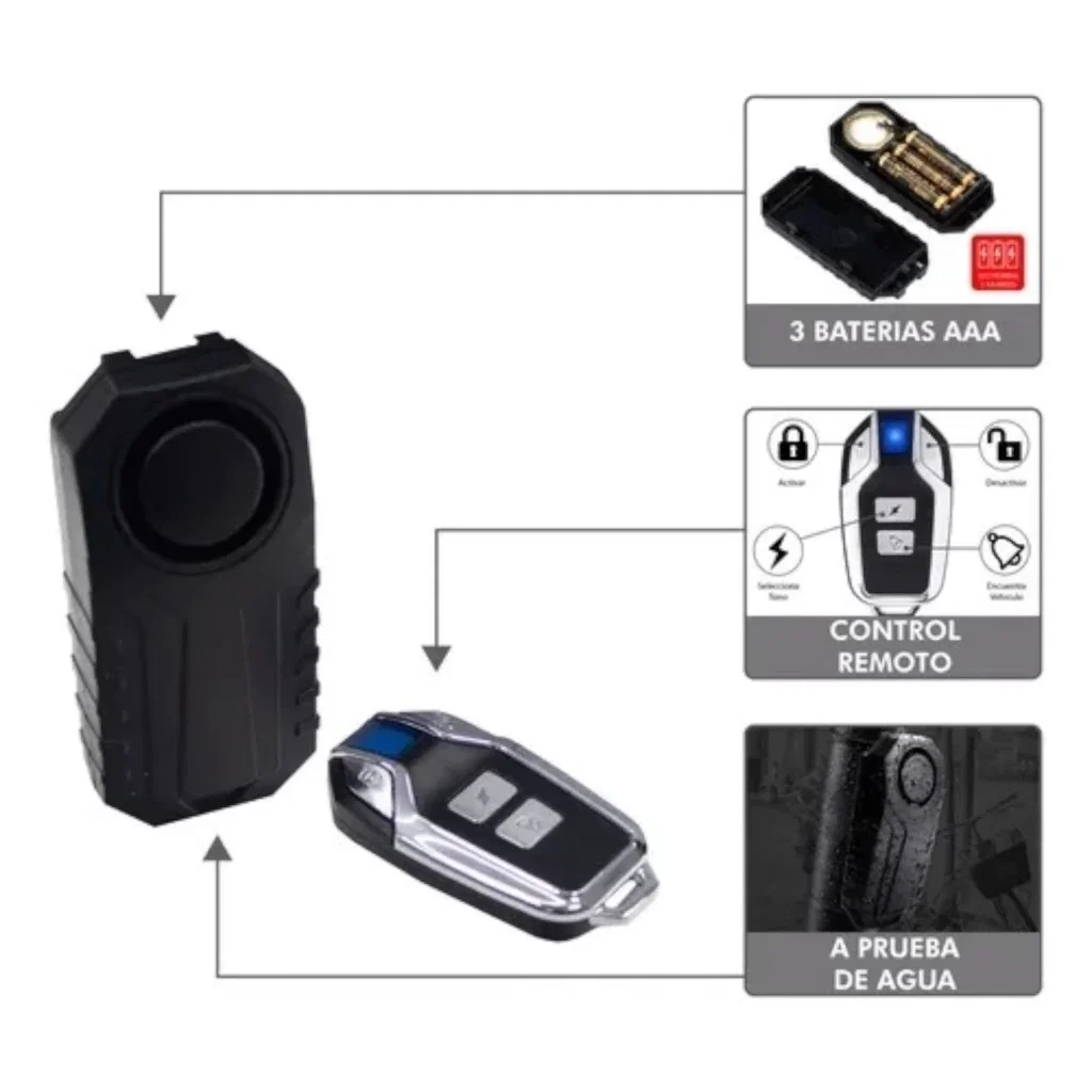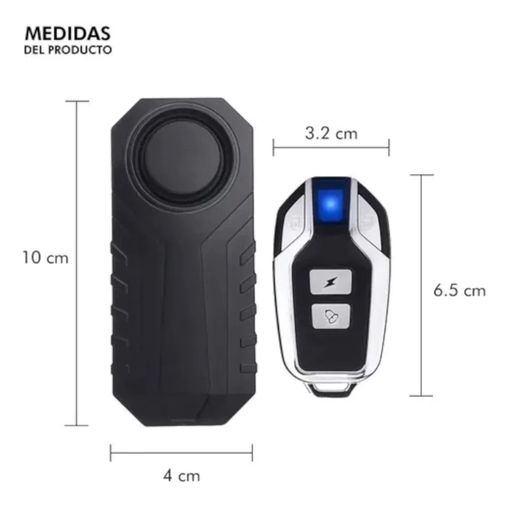 📦 Incluye alarma, soporte de fijación y control remoto