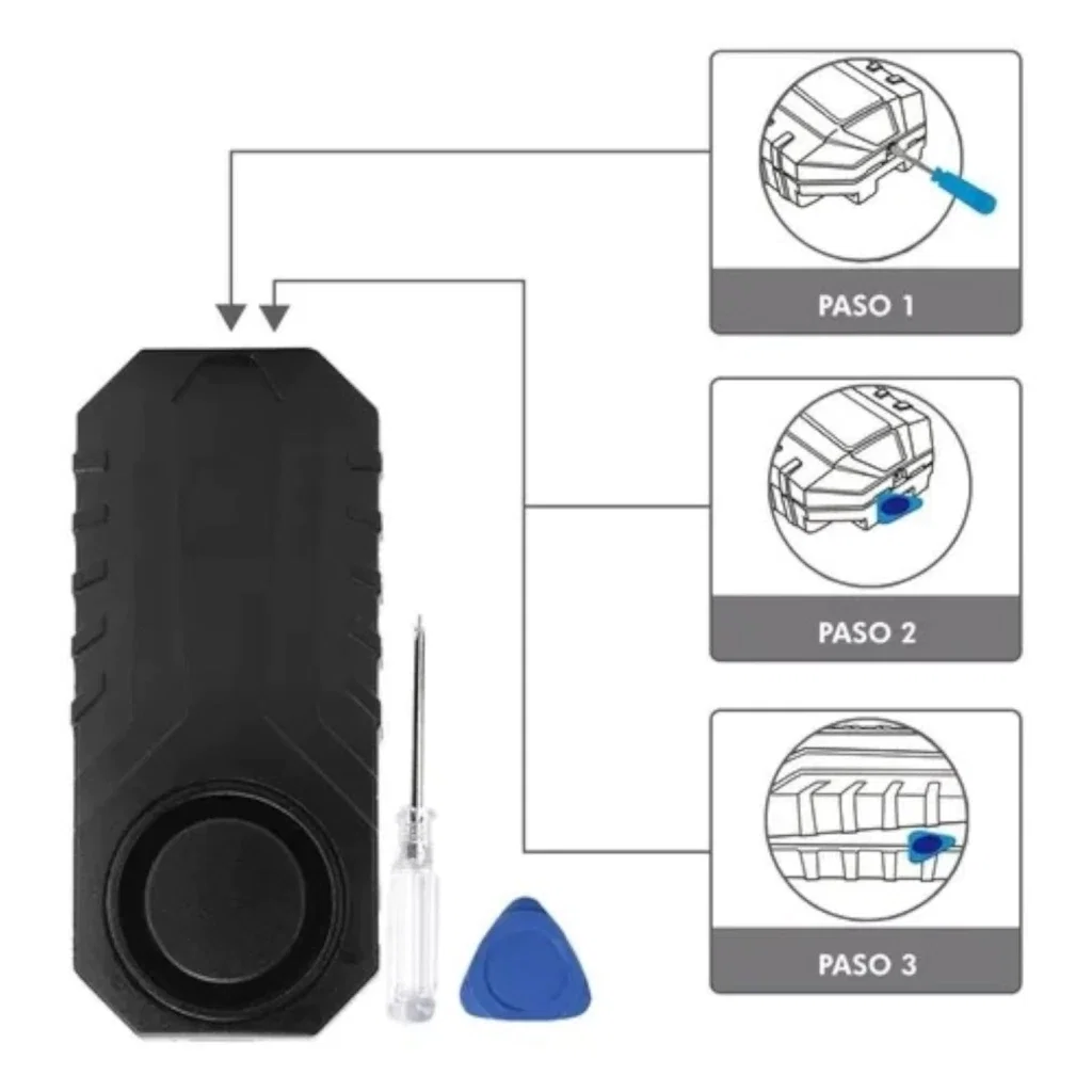 Dispositivo de seguridad con sensor de movimiento y vibración. Emite sonido de alta potencia para disuadir robos.