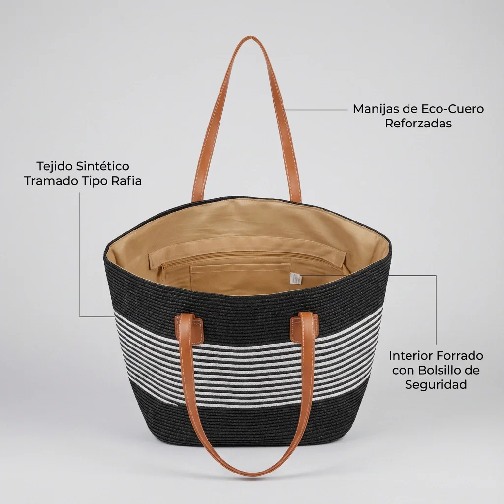 🧱 Materiales: cuerpo tejido sintético tipo rafia; manijas y refuerzos en símil cuero