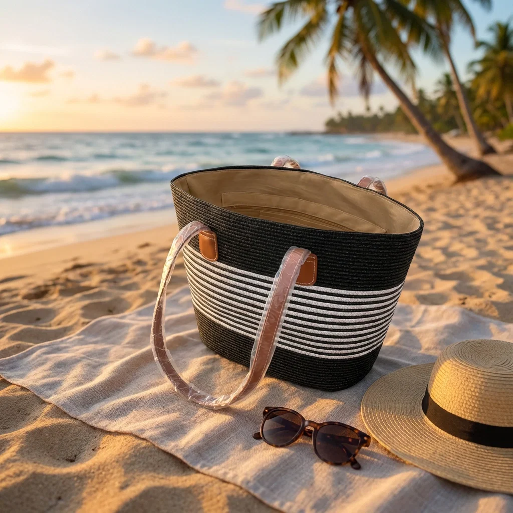 📏 Tamaño: formato grande tipo tote; capacidad amplia para objetos personales, toalla o ropa liviana
